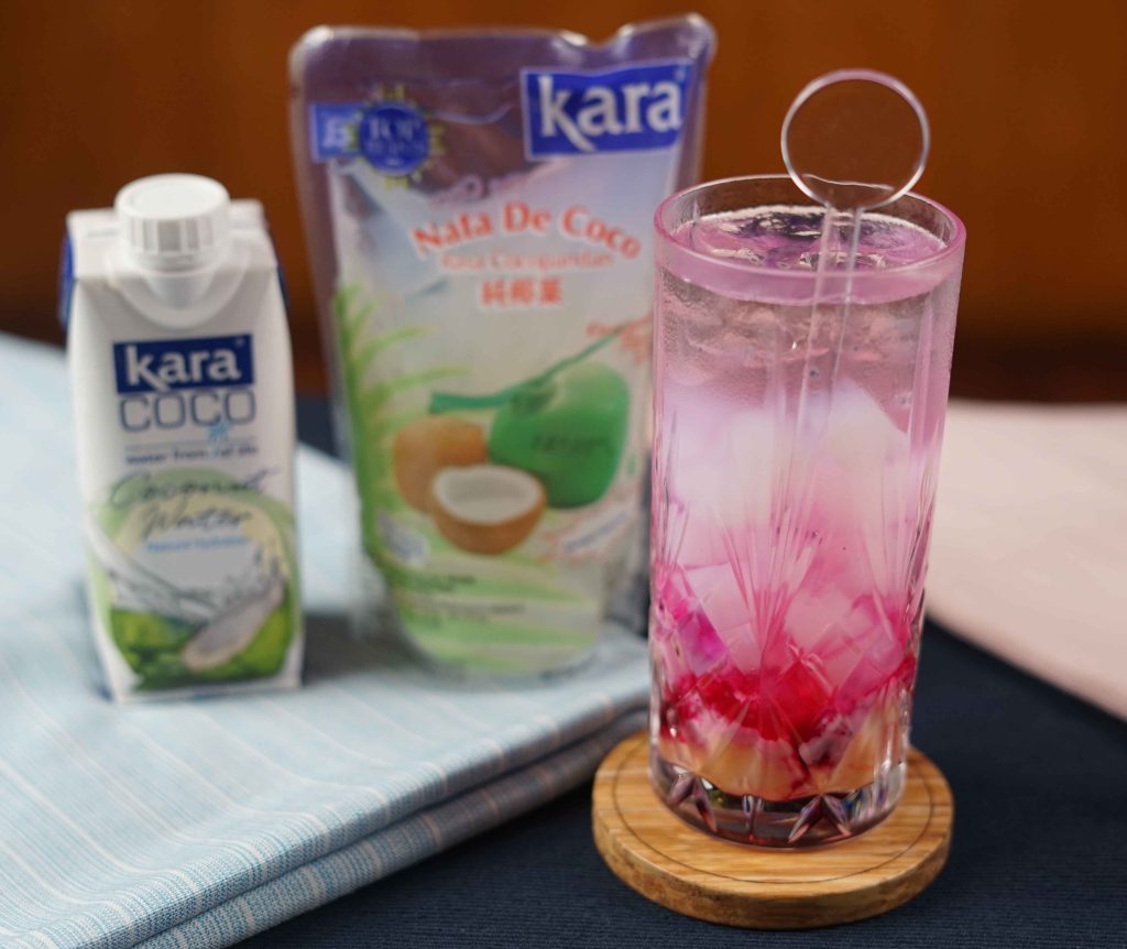 3. Masukkan Kara Nata de Coco dan Kara Coco Coconut Water sampai gelas penuh